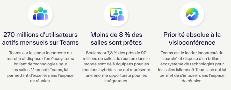 Une salle Microsoft Teams est une solution de salle de réunion de pointe. Elle est conçue de manière experte pour combler les écarts entre les lieux et les individus dans les environnements de bureau, en intégrant de manière transparente les travailleurs hybrides aux réunions grâce à Teams. De ce fait, les salles Microsoft Teams favorisent des réunions inclusives et collaboratives. Elles garantissent que tous les participants ont une présence égale au sein de la réunion (quel que soit leur emplacement de connexion).