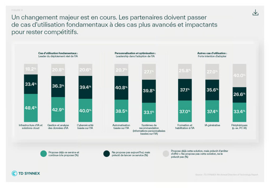L’IA s’impose désormais comme un standard. Une large majorité de partenaires de distribution la considère comme essentielle à leur avenir, ce qui confirme une bascule : l’IA n’est plus un « plus », c’est un prérequis. Pour les partenaires du channel, cela implique une pression concurrentielle croissante : si tout le monde avance dans la même direction, la différence ne se fera pas sur l’intention, mais sur l’exécution.
