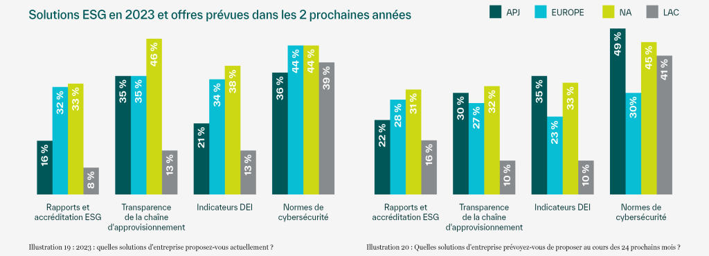 Non seulement les organismes de réglementation bouleversent la situation, mais les clients aussi. Selon l’enquête mondiale de 2023 sur le développement durable de Canalys/Candefero, 69 % des acteurs du réseau de distribution voient désormais des considérations ESG influencer les achats informatiques, et 51 % déclarent proposer des programmes de reprise en faveur du recyclage ou de l’économie circulaire. Nous avons également noté une augmentation des solutions ESG proposées, en particulier en Amérique du Nord (NA) et en Europe. D’autres partenaires prévoient de proposer ces solutions d’ici 2025.