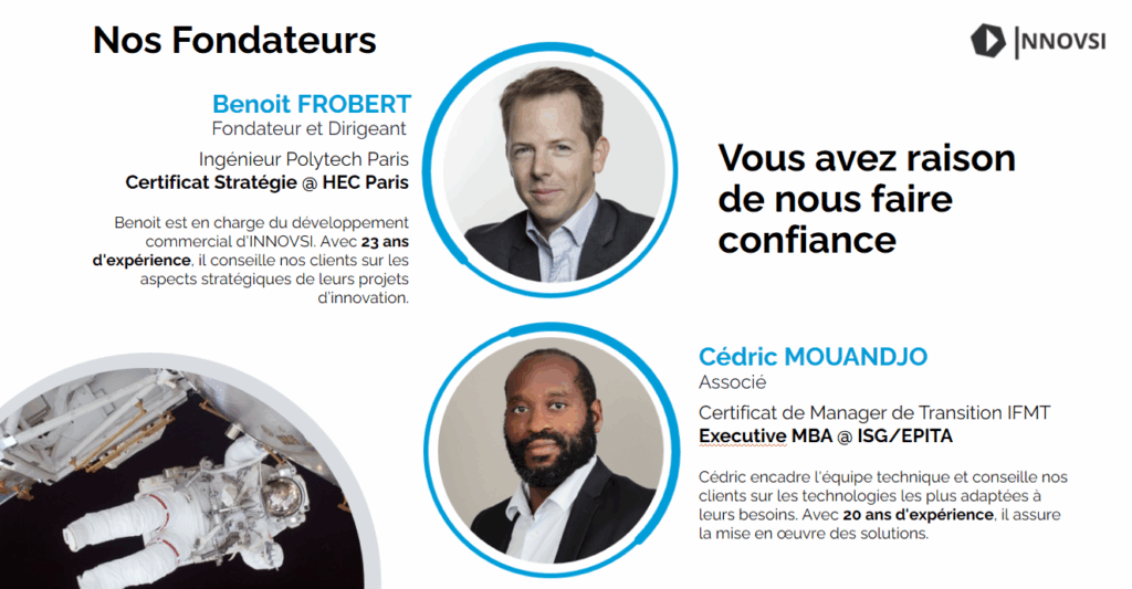 Fondée en 2016, INNOVSI s’est donnée pour mission de transformer les ambitions digitales en projets concrets et performants. L’entreprise accompagne ses clients dans la conception de nouvelles expériences utilisateurs tout en générant de la valeur. Sa devise : Innover – Piloter – Accompagner.